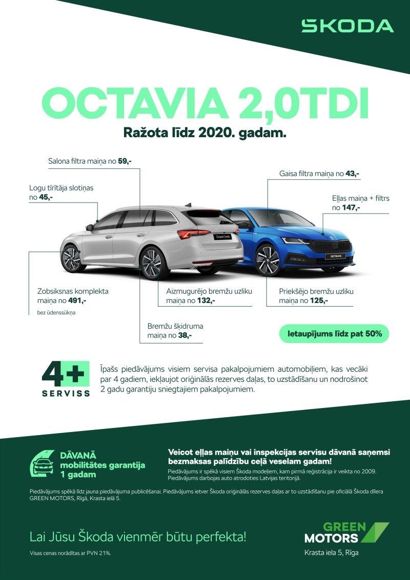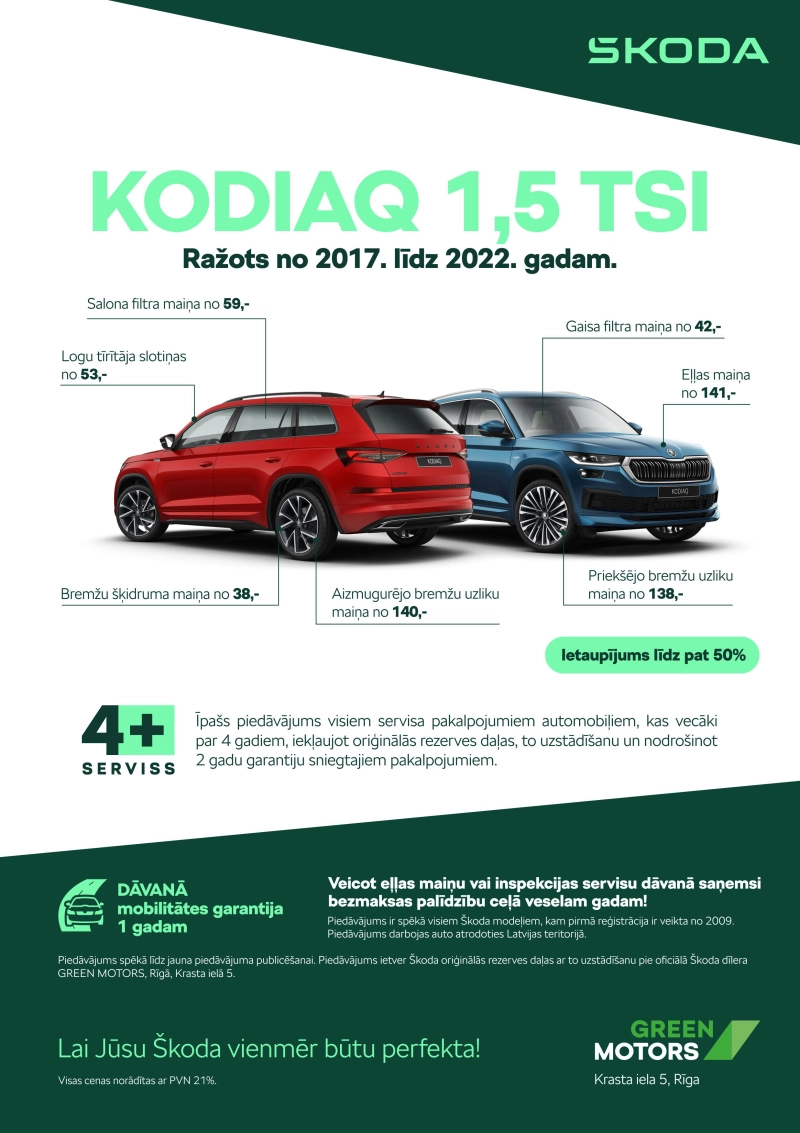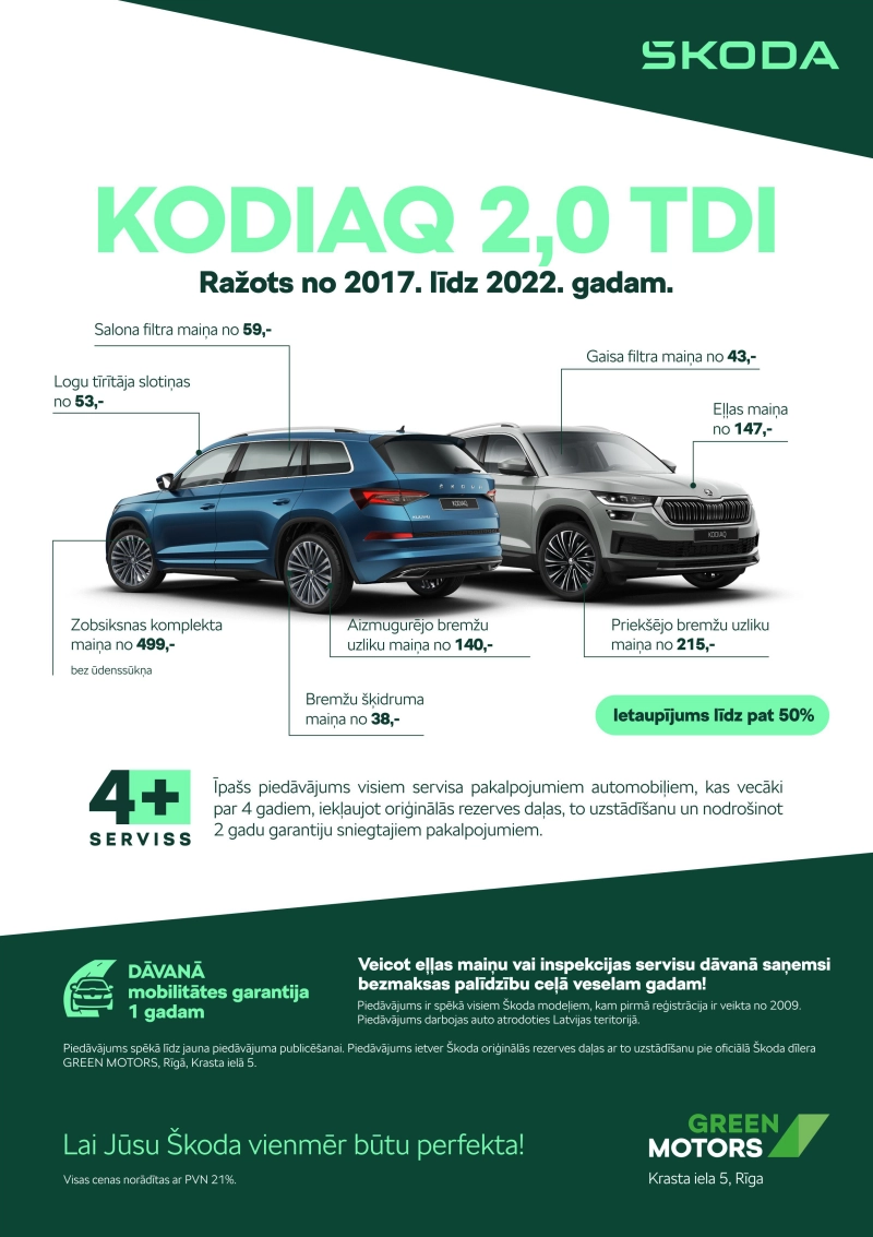 Mēs, Green Motors piedāvājam īpašu 4+ serviss programmu, kas paredzēta pēcgarantijas Škoda zīmola automašīnām.